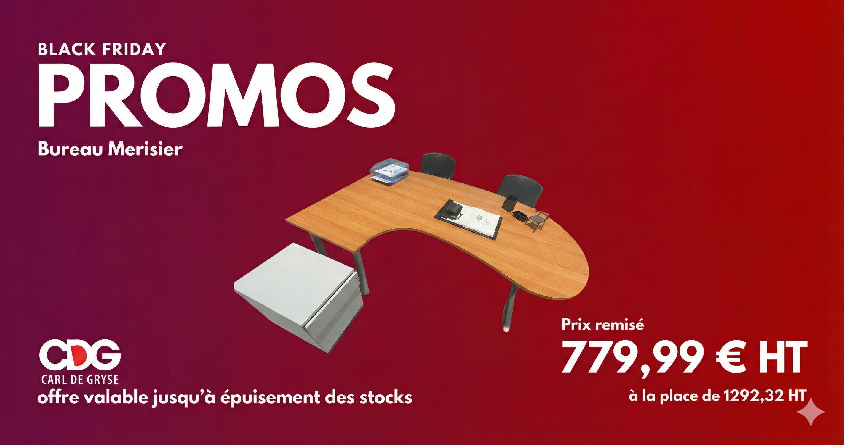 Le Black Friday est LE moment idéal pour moderniser vos espaces de travail à moindre coût. Cette année, nous vous proposons une remise sur l’un de nos modèles les plus appréciés : le bureau en merisier avec retour gauche, désormais à 779,99 € HT au lieu de 1292,32 € HT.